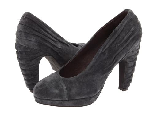 Platform pump with 3 1/2" heel, 1/2" platform. Color is grayish blue suede. Heel and back are ruched and the heel itself is dramatically curved to continue the curve of the back of the shoe. The curved heel and the ruching serve both as ornament and as part of the structure / function. The integrated design ties together the heel and the body of the shoe, for a simple effect that is anything but plain. A very elegant shoe.