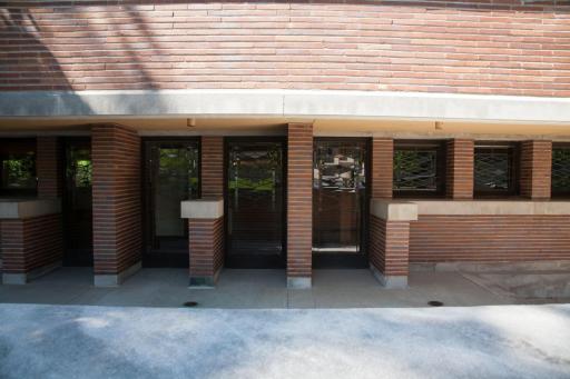 A radical rakingly-horizontal design on a tight city lot that focuses your attention. The structure is given immense three-dimensionality by means of the massive shallow roofs that overhang in all directions, along with the deeply set window ribbons. Long bricks, and emphasized horizontal joints all add to the radical horizon. The colors are simple and rich -- with the strong red brick, the offsetting neutral stone horizontal pieces and the rich playfulness of the window details. You experience the interior spaces as being expansive, because the ribbon horizontal windows provide continuous vistas in almost all directions. The materials of the interior are sumptuous wood and plaster and playful window designs